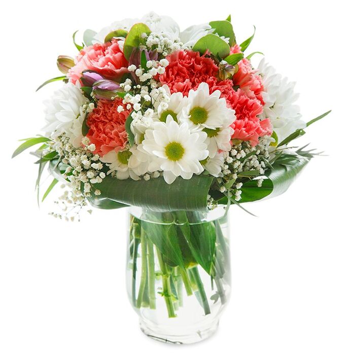 Elevate every occasion with our exquisite bloom collection. This striking arrangement features a harmonious blend of pure white chrysanthemums, airy gypsophila, and subtle light pink carnations, all gracefully accentuated by aspidistra leaves. Each flower is expertly hand-picked to ensure the highest level of freshness and quality, promising a look that is as timeless as it is elegant.